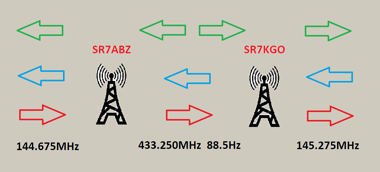 Sygnał odebrany przez antenę i TRX w pasmie 2m na częstotliwości 144.675MHz jest retransmitowany w paśmie 70cm na 433.250MHz z subtonem 88.5Hz i przekazany dalej na 145.275MHz.