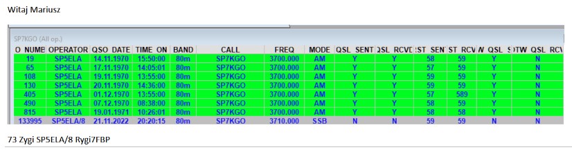 Wyjątkowym artefaktem upamiętniającym działalność klubową jest wyciąg z logu kolegi SP5ELA potwierdzający przeprowadzone łączności stacji SP7KGO.