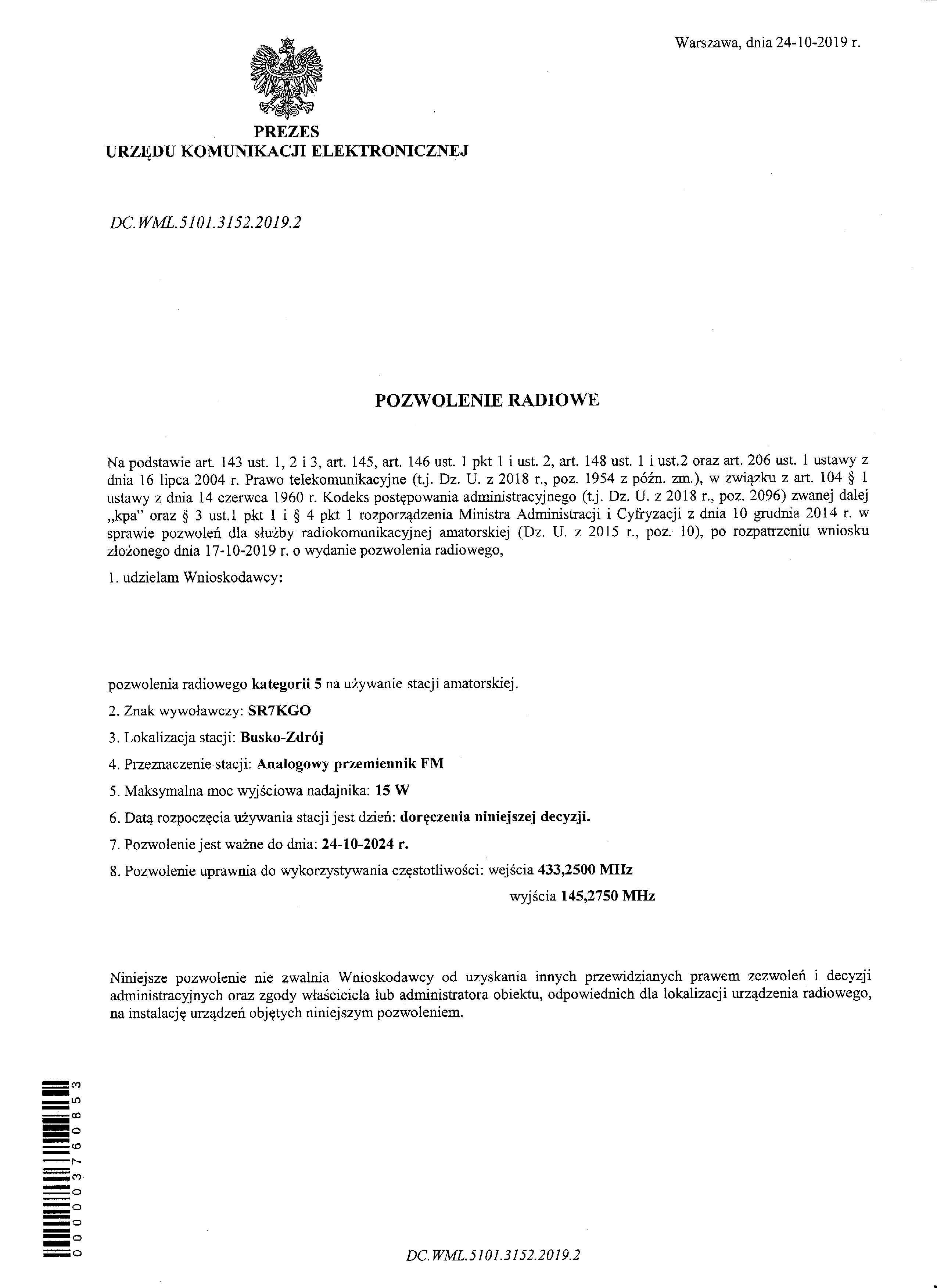 W 2019 roku grupa klubowiczów uruchomiła przemiennik crossband 2m <=> 70cm pod sufiksem identycznym jak znak klubowy SR7KGO.
